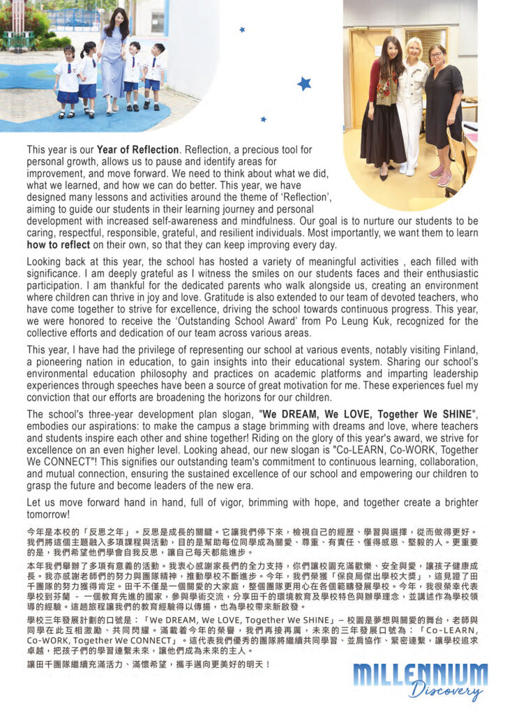 We value enabling students to learn joyfully and effectively according to their abilities and mental development. Through this process, we nurture their capacity for independent thinking, discernment, and lifelong learning. We aim to inspire their creativity and potential, help them build a positive and confident outlook on life, and lay a solid foundation for becoming good citizens. Guided by a spirit of mutual trust, mutual respect, unity, and shared goals, we work hand in hand with parents, strive for continuous improvement, and keep pace with the times to create an ideal learning environment and to become a quality school.